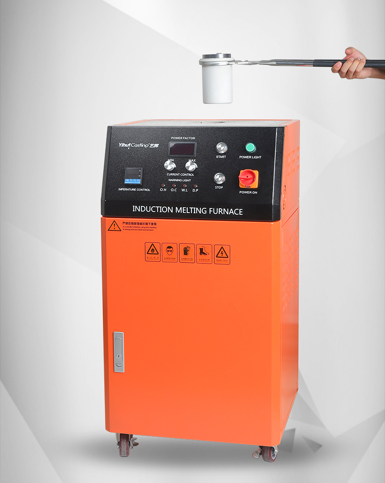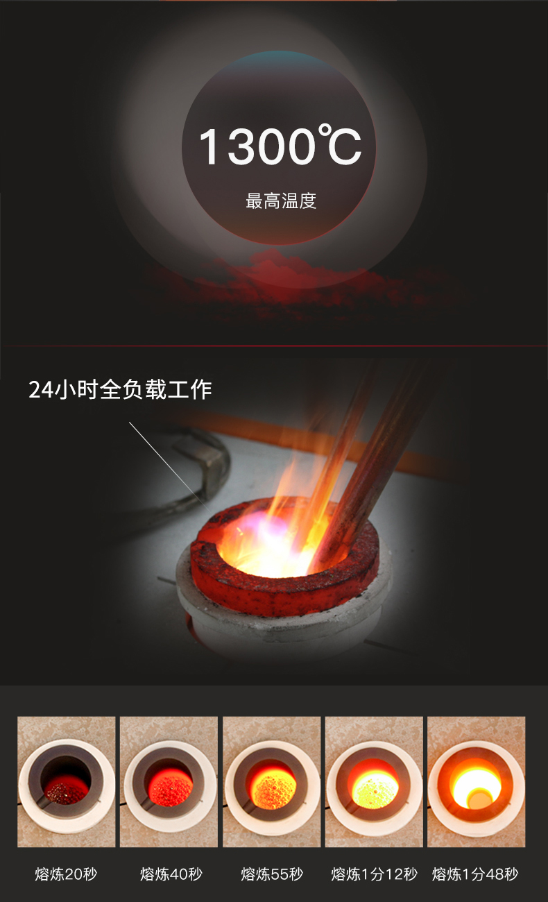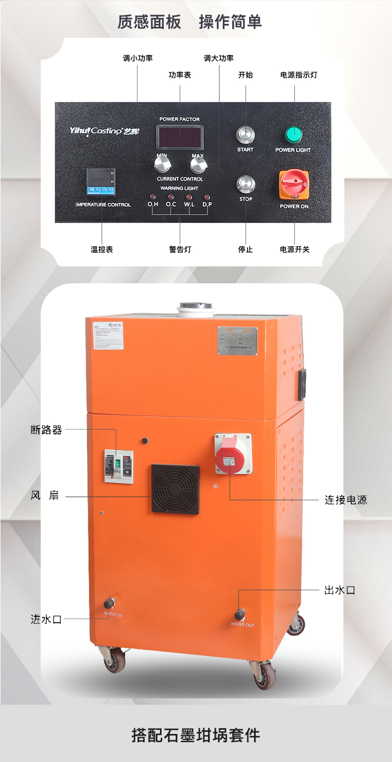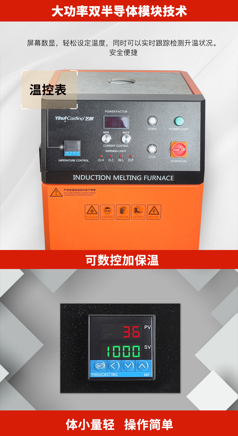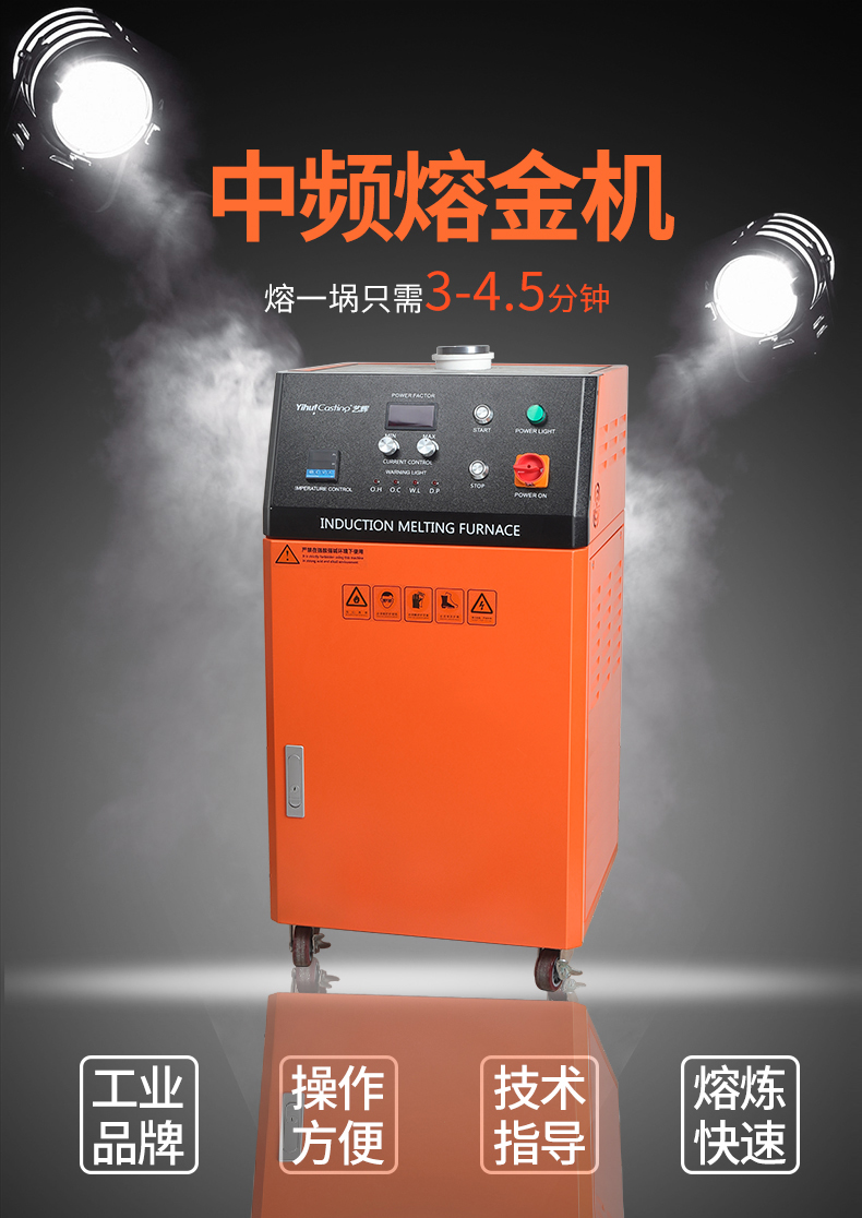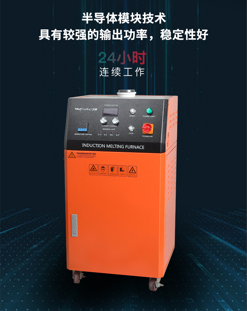 柜式设计、体积小、重量轻,安装操作简单方便,熔化时间约为3-4.5分钟,熔化效率高节电效果好,过载能力强,具有过压、过流、过热、缺水、缺相等多重保护设计,故障自动停机保护。感应线圈不带电安全可靠,进口IGBT模块设计,用料扎实,加热电源稳定耐用,100%全负载,24小时连续工作能力,多重保护设计,故障自动停机保护。