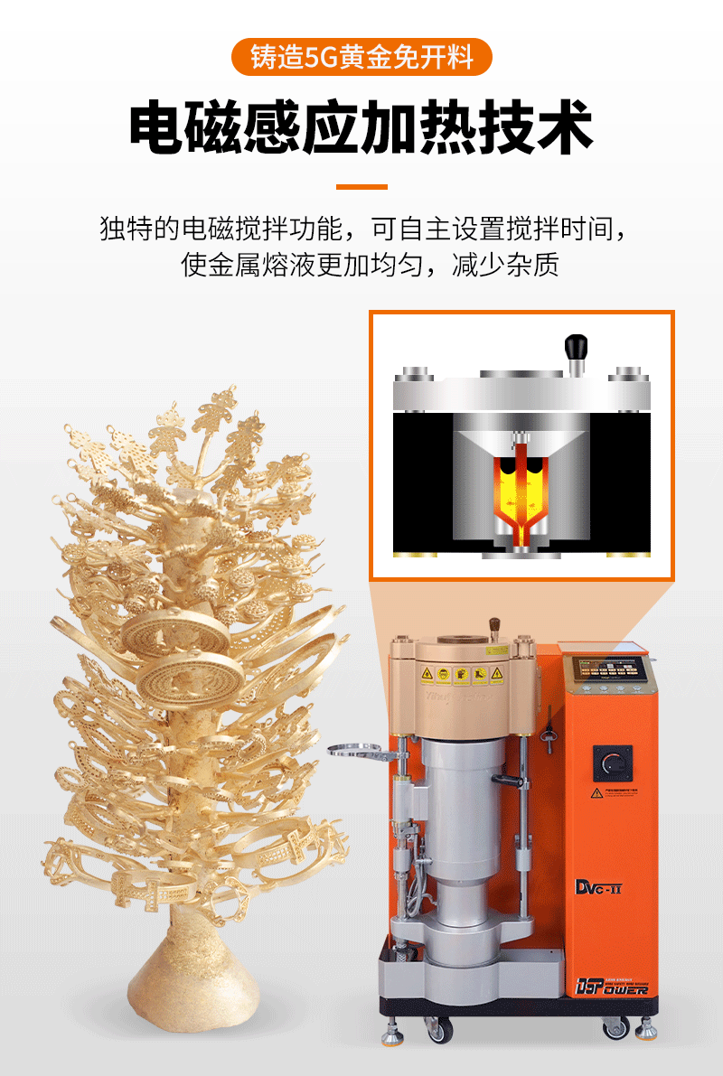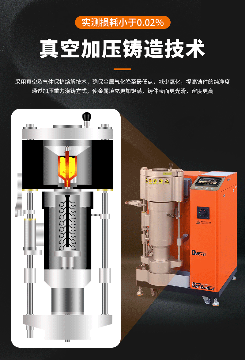 DVC-II自动真空加压铸造机是⼀款程序完全开放式,⽤⼾可⾃由编程满⾜各种⼯艺 、多功能性的真空加压铸造机,加热电源为中频数字处理电源 [注册商标DSPOWER] ,控温精准⼠1%,并带有超强的搅拌能⼒强,⾦属熔炼时处于镜⾯翻滚状态,实测损耗⼩于0.02%,铸造件成⾊⾼。⾃动诊断系统,铸造系统可靠性⾼,如钢盅真空漏⽓不进⾏铸造且⾃动提⽰,等多项保护。