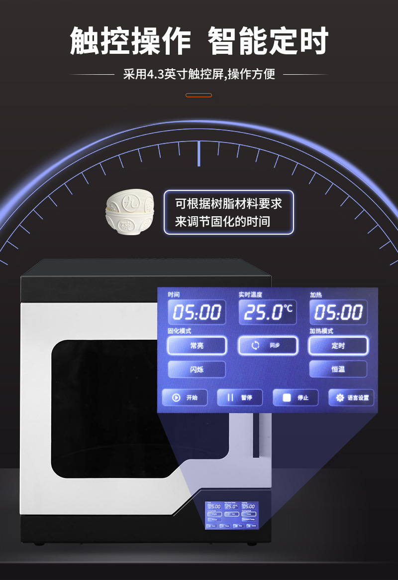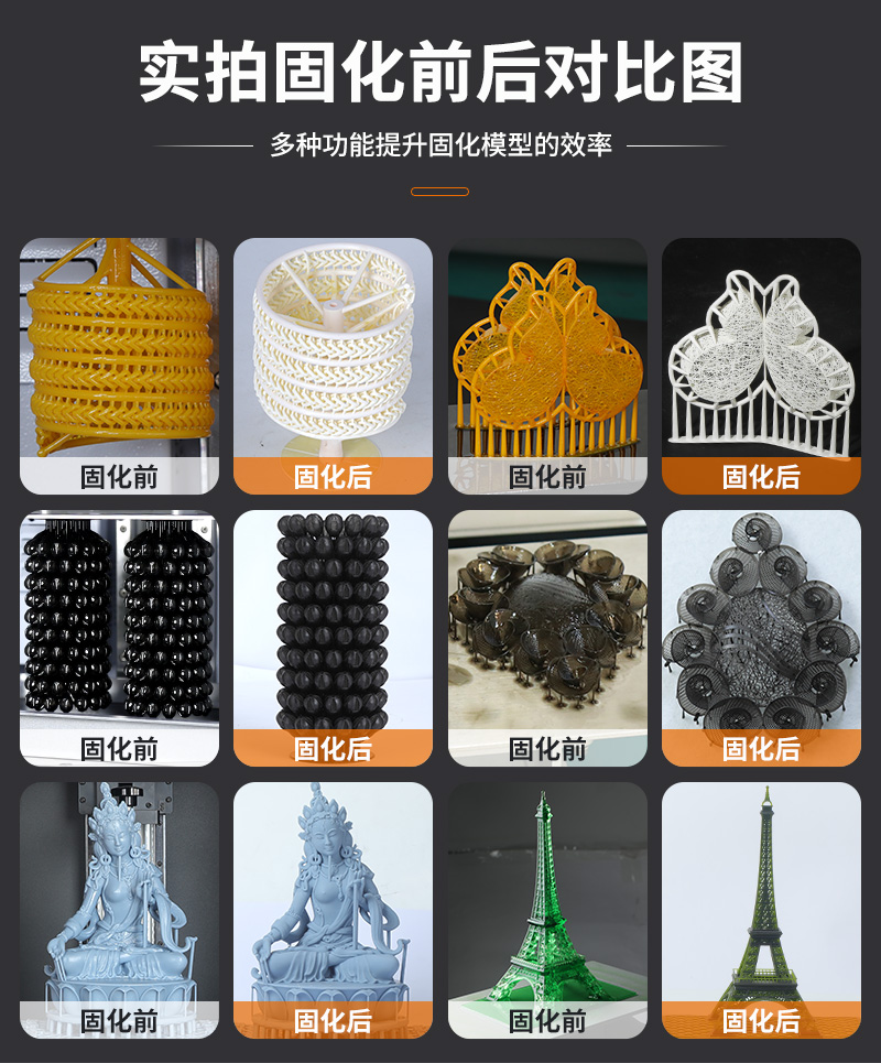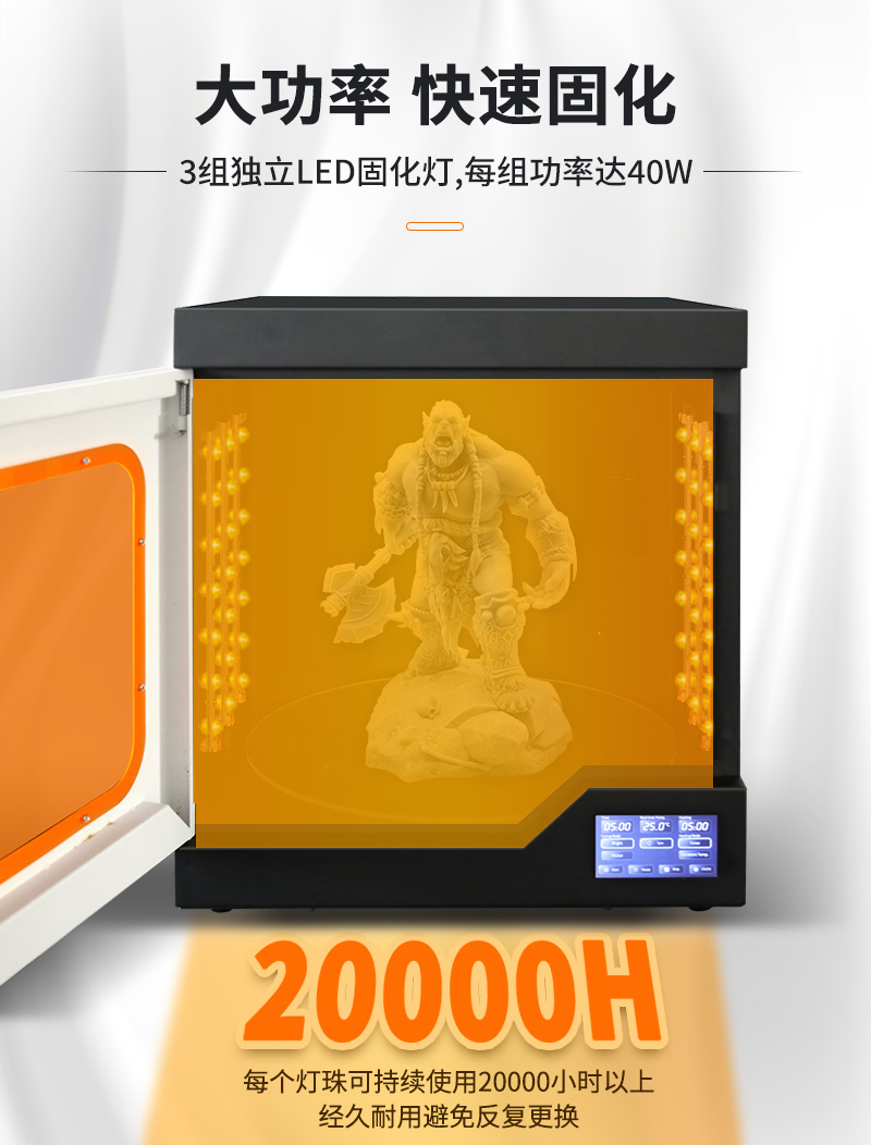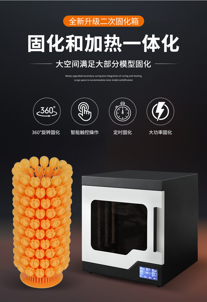 光固化树脂在刚刚打印结束时,表面会有一层未完全固化的软树脂,有一定的残留,通过固化箱二次固化的模型,会比普通模型硬度更高,表面更光滑,打印完后经过固化机几分钟时间就可快速完全固化。