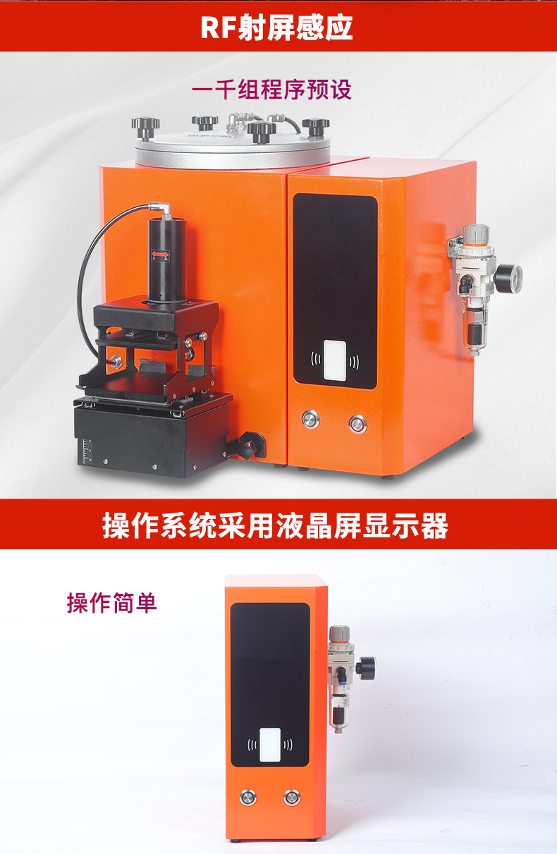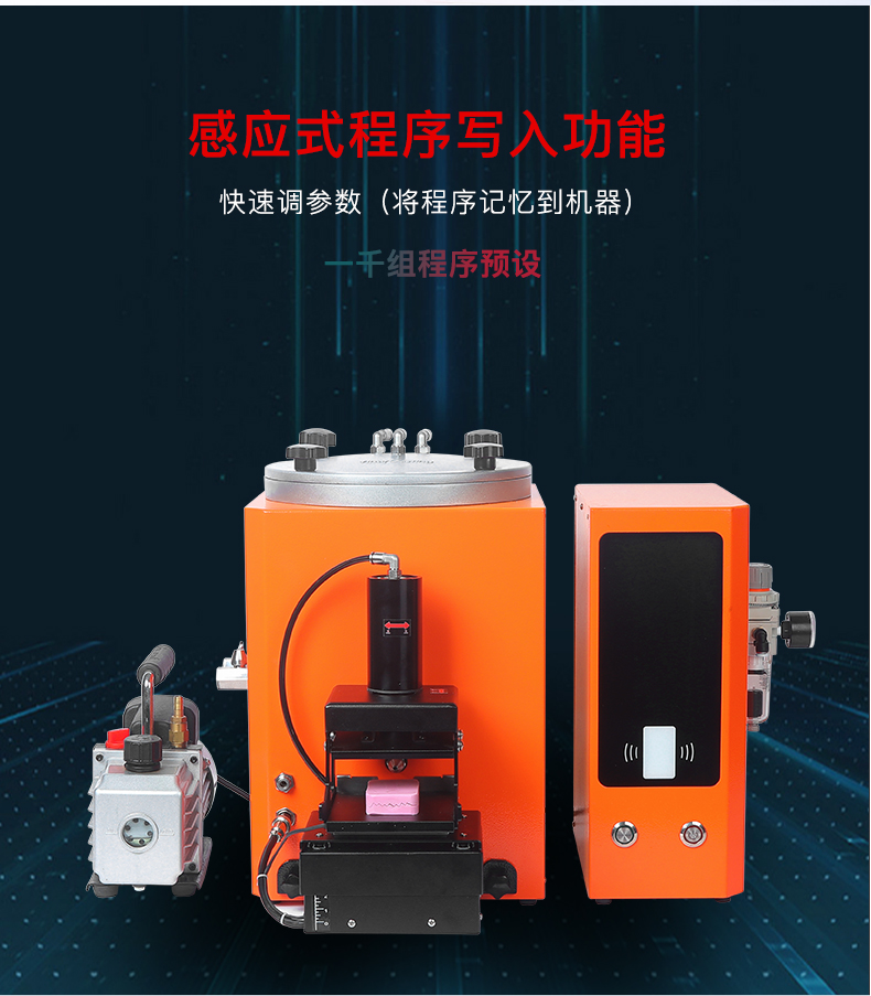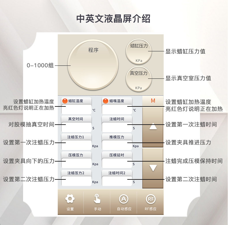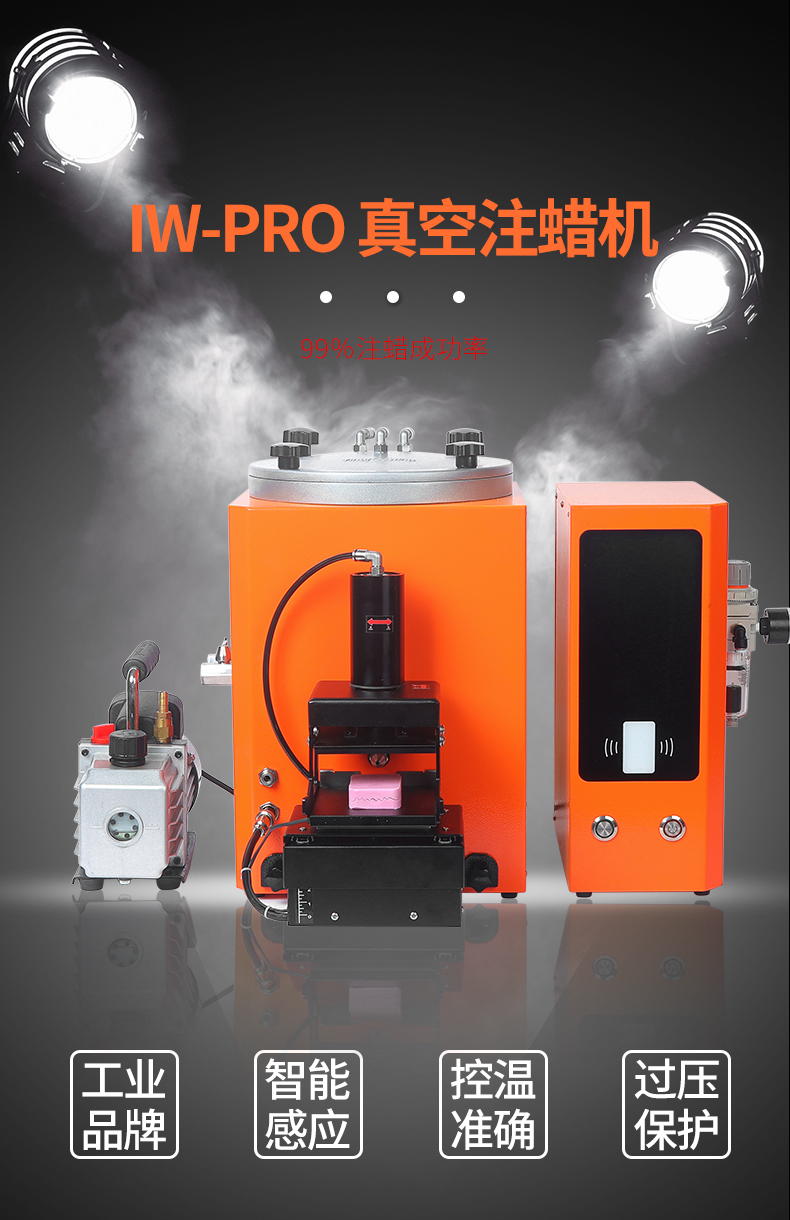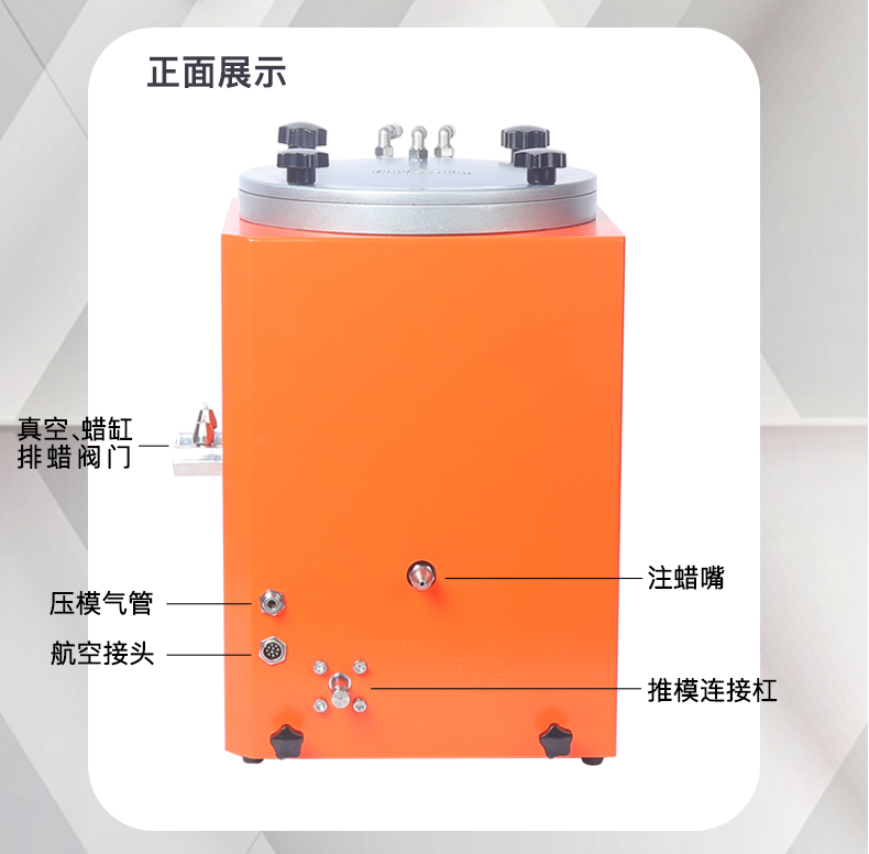采用一线品牌零部件、高水平工艺制造出的高品质注蜡机。此机配有手动升降夹具,可以让操作员无需使用任何工具,只需用两个手指就可轻松便捷、准确地向上或向下调整胶膜上下位置,使胶膜更容易对准注蜡嘴。