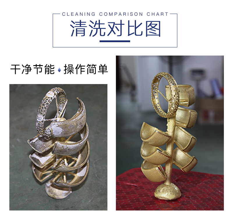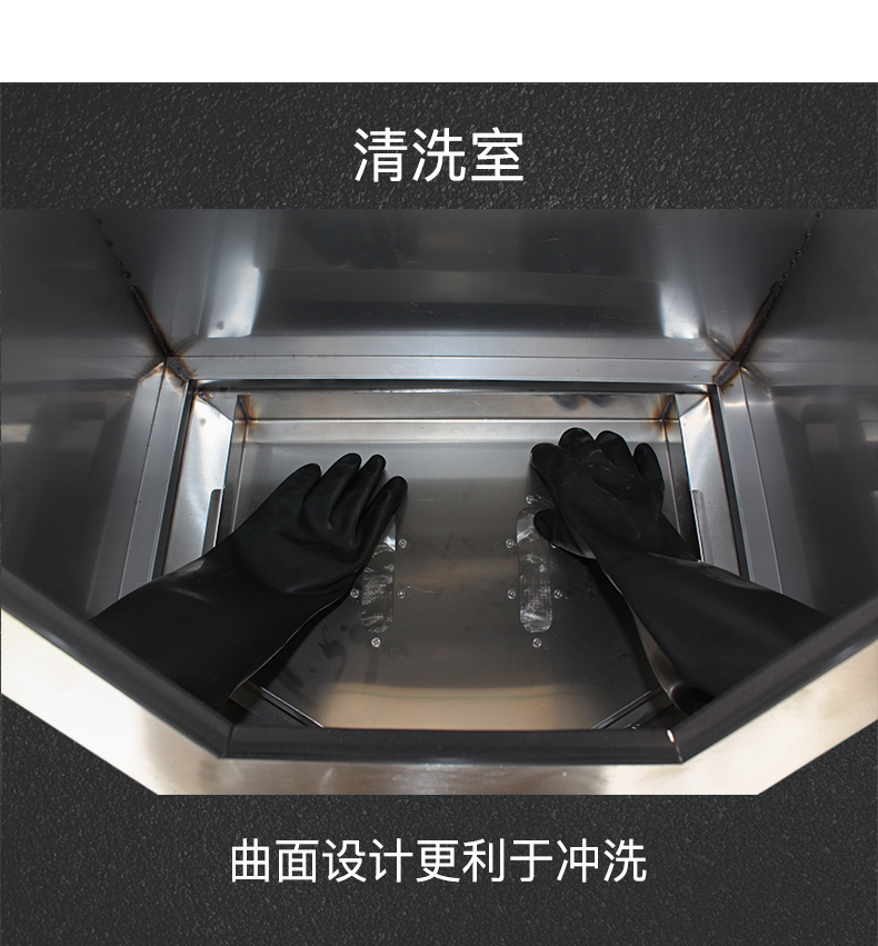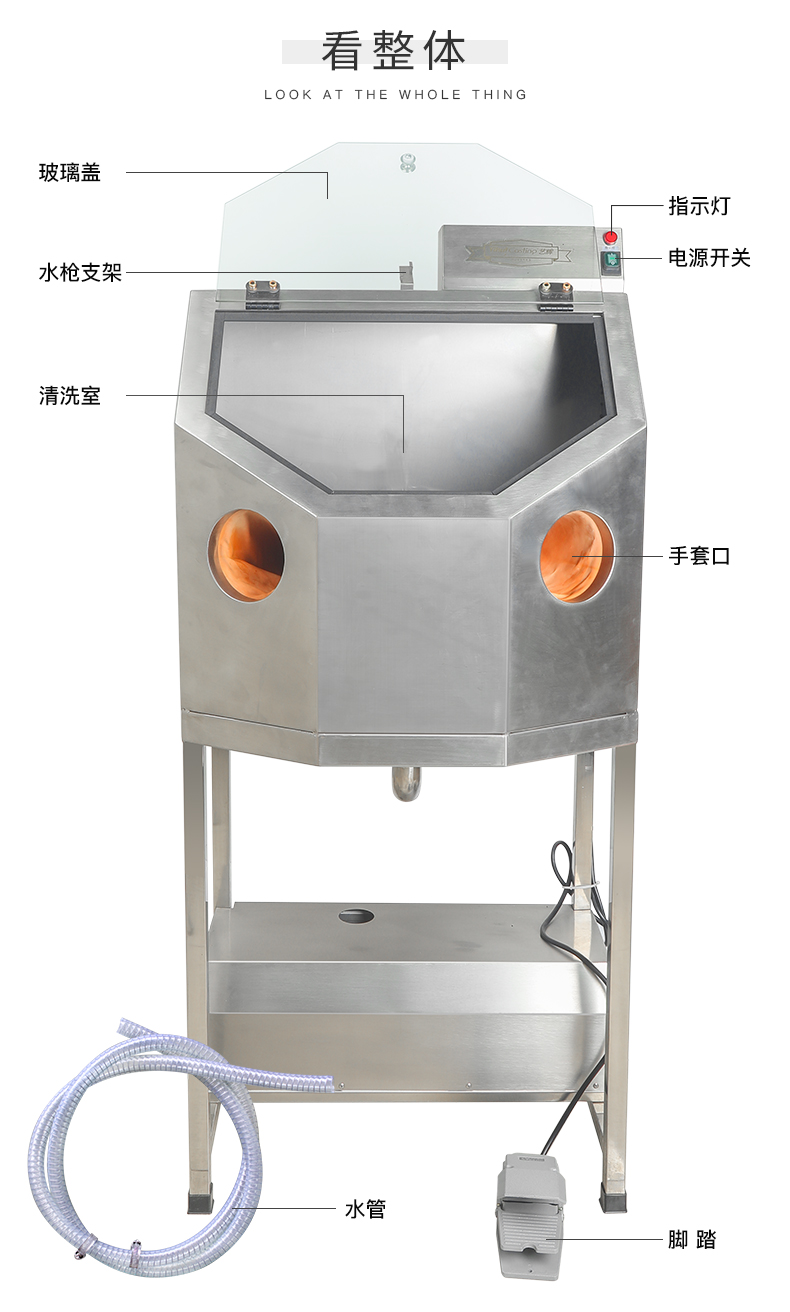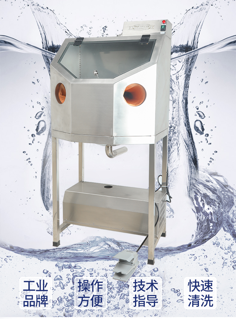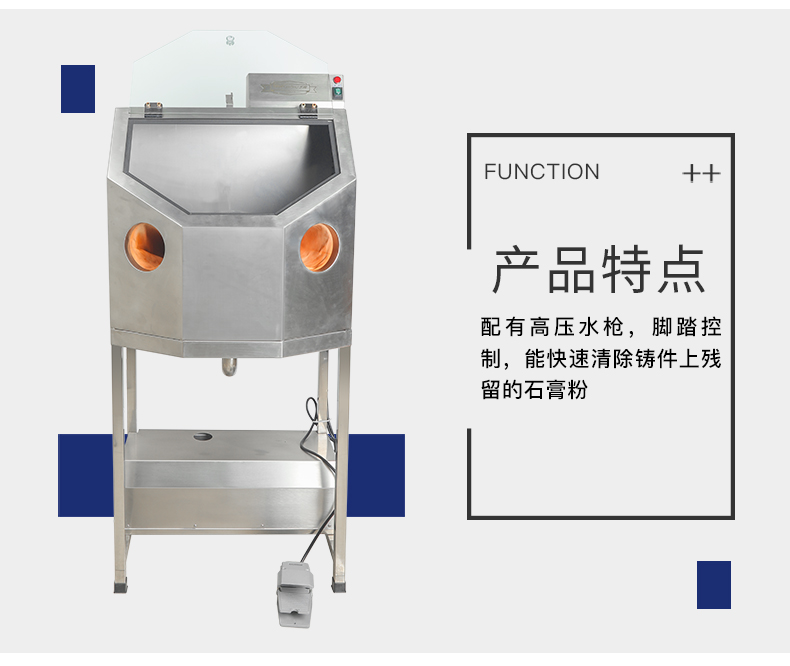 不锈钢机身,亚克力高透视大窗口,清洗效果一目了然,内置高压清洗喷嘴,通过脚踏操控,能快速有效清除铸件上残留的石膏粉。具有加工范围广,清洗更干净、节能,操作简单等。