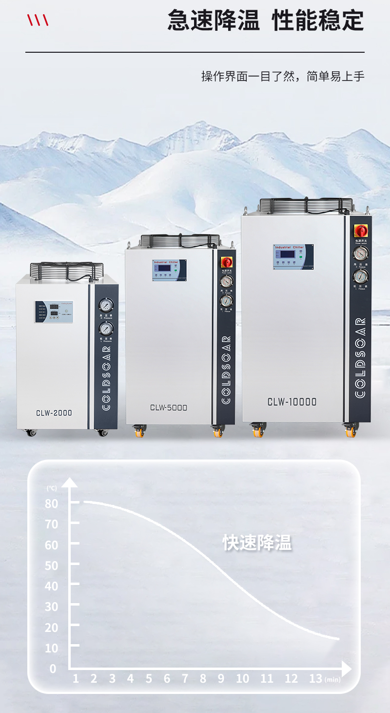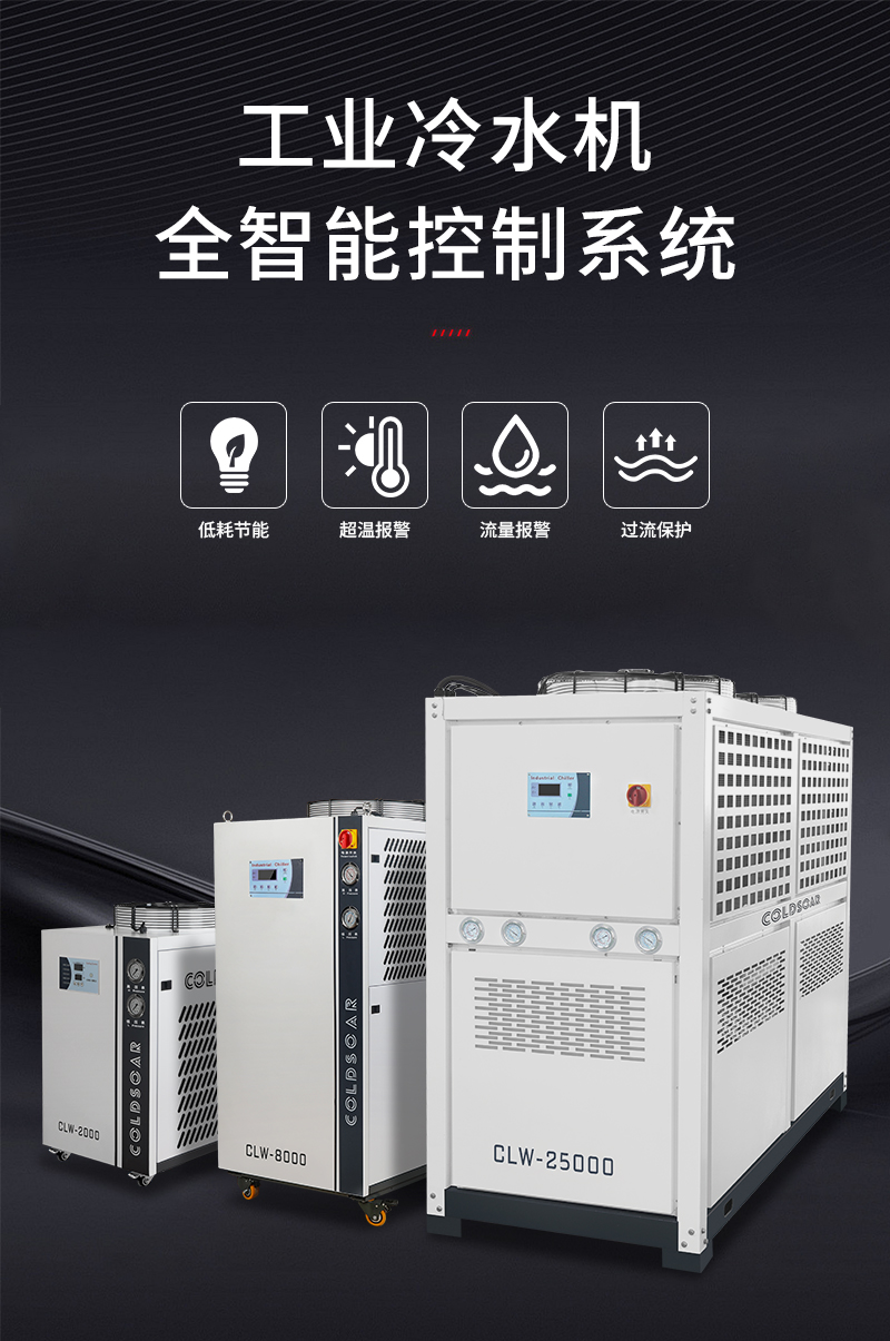 2、款式齐全:冷水机里整机运行功率和运行温度都有常温冷水机,低温冷水机,超低温冷水机三种款式,对各个行业单机控温专配非常方便。